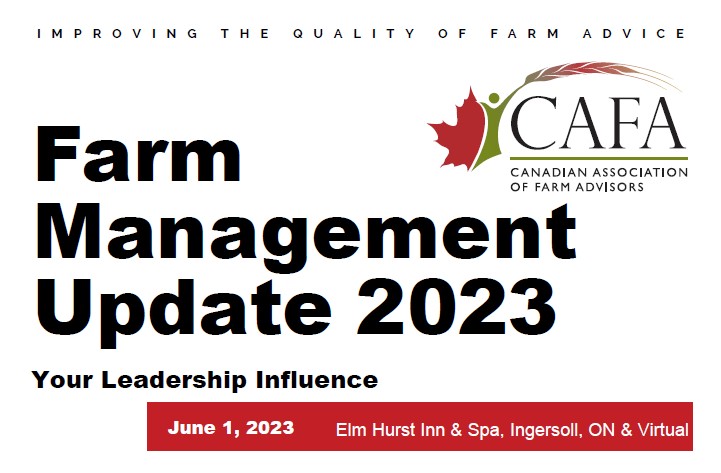 Farm Management Update: Your Leadership InfluenceStart Date: 6/1/2023 8:00 AM EDT End Date: 6/1/2023 4:00 PM EDT Venue Name: Elm Hurst Inn Location:415 Harris Avenue Ingersoll, ON Canada N5C3J8 Cost: $300 + HST CAFA & OIA MembersRSVP date: May 26, 2023 Organization Name: CAFA Contact:Speakers TBA